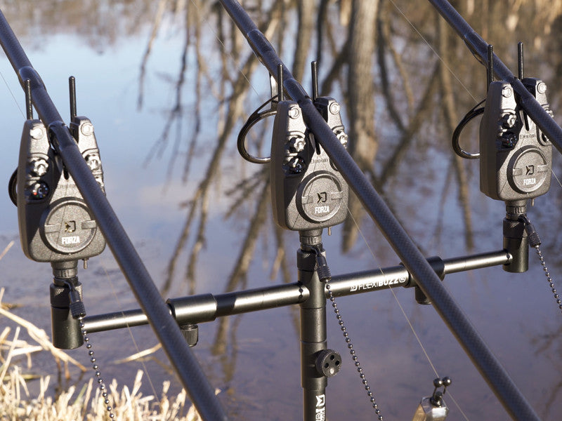 FlexiBUZZ — это универсальный бузз-бар с стандартной резьбой, совместимой с большинством стойк на рынке. Его телескопические плечи позволяют легко регулировать ширину бузз-бара, чтобы он подходил под размеры катушек. Частая конфигурация среди рыбаков — удлинение переднего бузз-бара, чтобы кончики удилищ были слегка разведены в стороны для лучшего расстояния между ними.