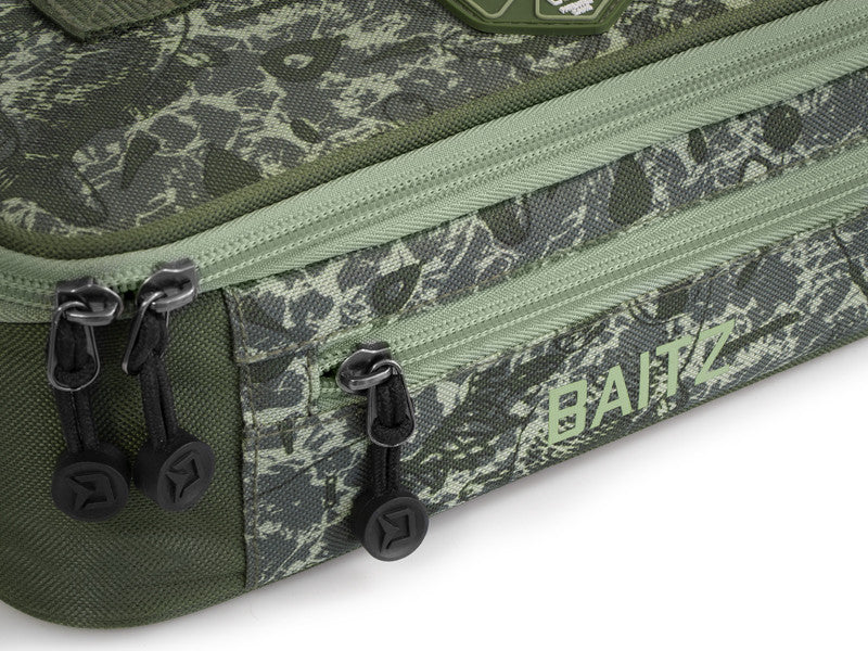 Стены и крышка сумки оснащены 6 мм плотной прокладкой. На крышке предусмотрён сетчатый карман для дополнительных рыболовных аксессуаров. Ещё одно преимущество — маленький передний карман для игл или стопоров для быстрой сборки оснастки.