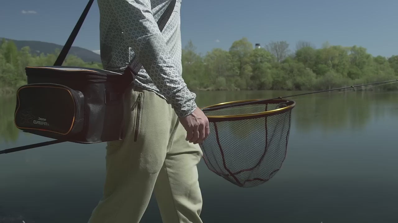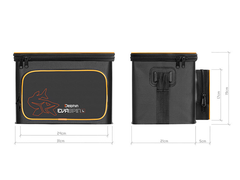 Сумки для спиннинга EvaSPIN отличаются современным дизайном в комбинации черного и серого цветов, дополненным оранжевыми элементами, включая логотип в форме щуки. Сумка оснащена регулируемым плечевым ремнем, который облегчает переноску и обеспечивает рыболову высокую мобильность.