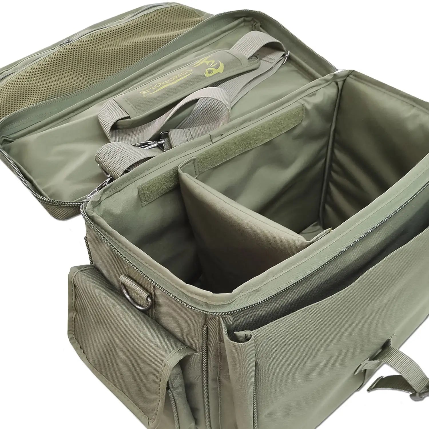 Центральное отделение с жесткой мобильной перегородкой на липучке (застежка "Velcro"). Специальное место под рыболовную пластмассовую коробку для снастей. По бокам и спереди запасные отделения и карманы для рыбацких аксессуаров. В комплекте с сумкой идет удобный плечевой ремень на металлических карабинах. На верхней крышке - ручка для транспортировки. Закрывается сумка на клапан с застежкой типа "трезубец".