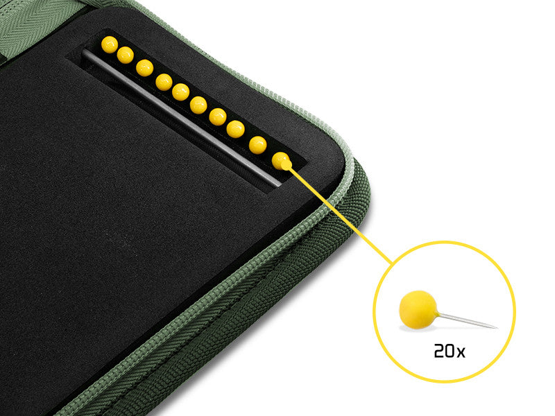 Кейс имеет простую конструкцию с твердым пеноматериалом внутри с двумя вырезами. Внутри находятся две стальные планки для крепления оснасток. Также в комплект входят 20 штырьков для натяжки и фиксации оснасток, что достаточно как для начинающих, так и для опытных рыбаков. Внешняя часть покрыта износостойким материалом, а закрывается кейс металлической молнией с логотипом Delphin.