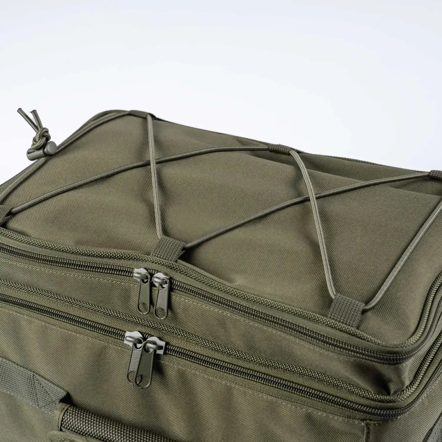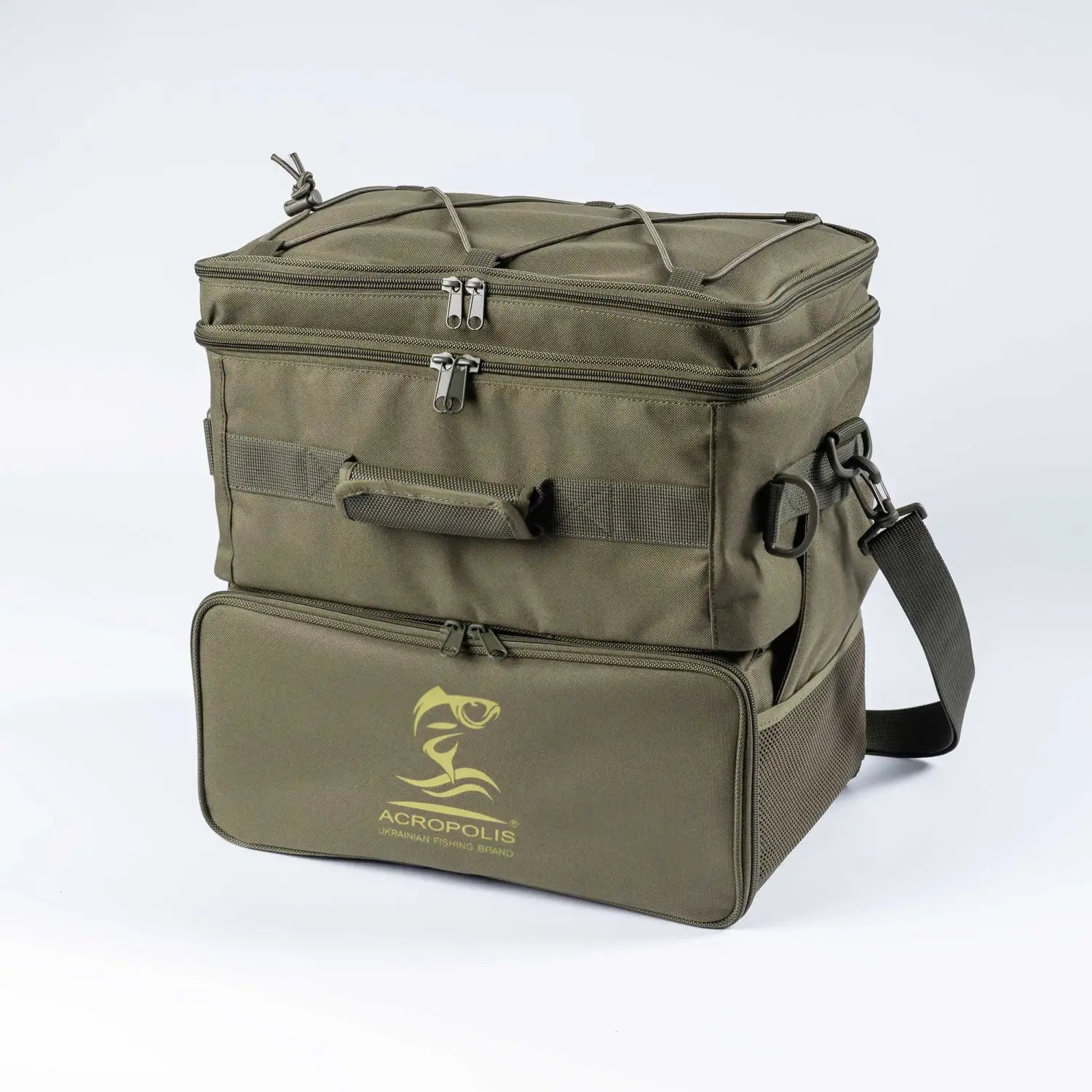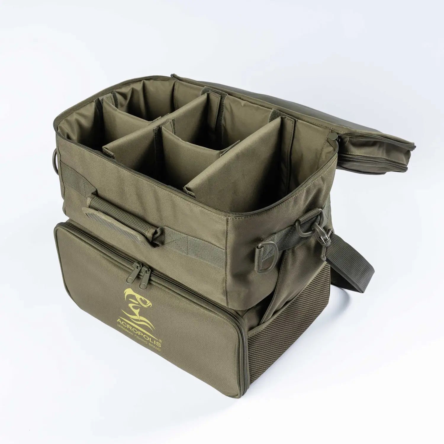 Многофункциональная рыболовная сумка для различных видов рыбалки. Динамическая конструкция позволяет эффективно использовать каждый из отсеков, как отдельную рыболовную сумку или как большую фидерную, карповою или спиннинговую сумку для рыбалки. Нижняя часть сумки - трансформера рассчитана под различные рыболовные аксессуары, пластиковые коробки, одежду. Верхняя - для транспортировки катушек с запасными шпулями (до 6 штук) и мелких инструментов. В середине - мобильные перегородки на липучках. Внешне - есть крепления для плечевого ремня и ручка для переноса сумки в руках.