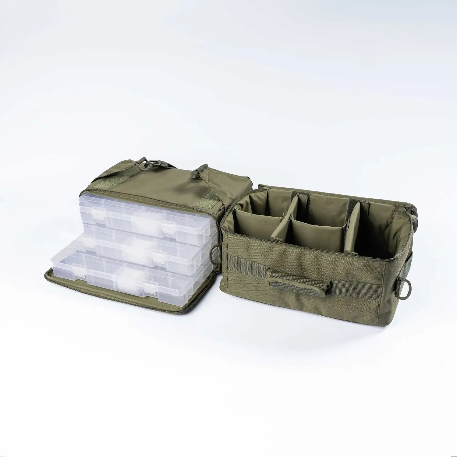 Нижняя сумка рыболовная комплектуется 3-мя большими прозрачными коробками (35,5х21,5х5см) из пластика для снастей. Каждая коробка закрывается на 2 крепких клапана и имеет внутри мобильные перегородки. Вы можете самостоятельно проставить себе нужное количество и размеры ячеек под воблеры, джерки, силиконовые приманки, крючки, грузики и др. Коробки вытягиваются и тогда сумку можно использовать по другому назначению, например - сложить туда одежду, посуду или иное рыболовное снаряжение.