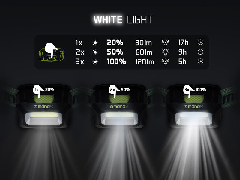 Lumina albă are trei moduri de funcționare. Prima apăsare a butonului activează un mod de intensitate de 20% timp de 17 ore. O a doua apăsare activează un mod de intensitate de 50% cu 60 de lumeni de luminozitate, cu o durată de 9 ore. O a treia apăsare activează modul maxim cu intensitate de 100% timp de 5 ore. Pentru a activa lumina verde, apăsați și mențineți apăsat butonul. Primul mod verde cu intensitate de 100% durează 12 ore, în timp ce o a doua apăsare activează luminozitatea de 50% cu o durată de funcționare impresionantă de până la 40 de ore. Lumina verde nu atrage insectele, fiind deosebit de convenabilă în serile călduroase de vară.