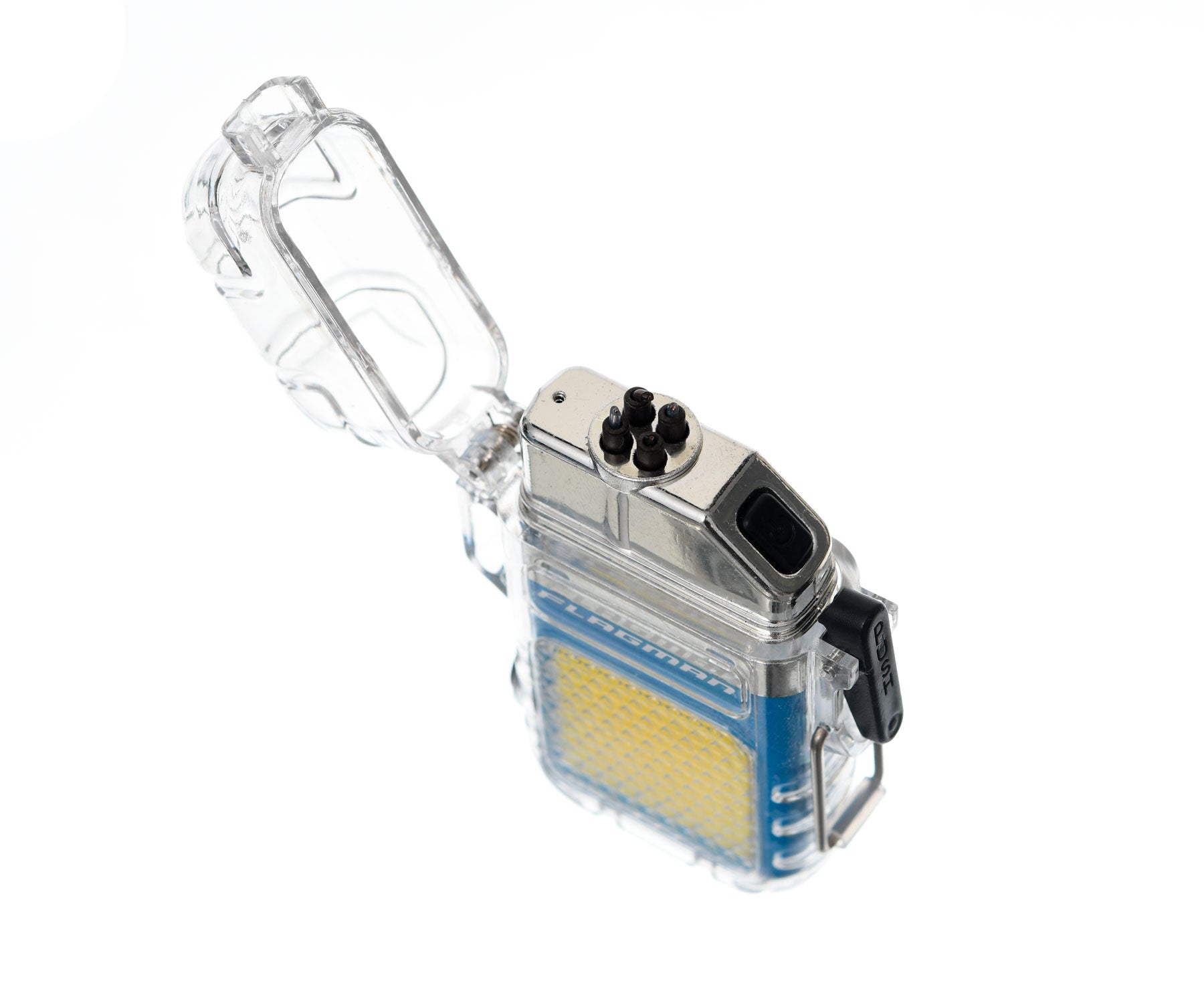 Un companion de încredere pentru pescuit, vânătoare, camping, drumeții, viața de zi cu zi și situații extreme. Bricheta electrică cu impulsuri Flagman funcționează pe un principiu complet diferit față de brichetele tradiționale pe gaz, benzină sau electronice cu arc incandescent. Între două contacte se creează o descărcare electrică puternică cu impulsuri, care aprinde obiectele inflamabile. Bricheta este echipată cu o lanternă LED COB și trei moduri de funcționare: lumină caldă puternică, lumină caldă economică + intermitent. Lampa Flagman Lighter + este alimentată de o baterie Li-Ion încorporată. Este inclus un cablu USB pentru încărcare de la o priză de perete sau un power bank.