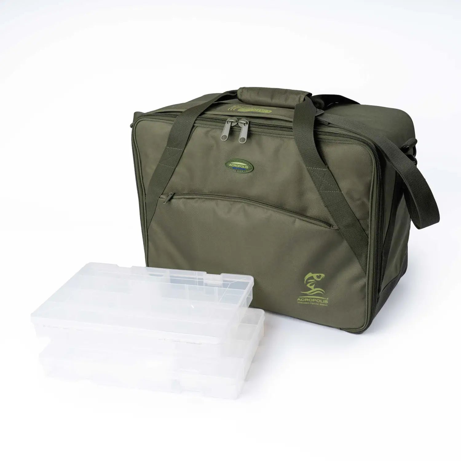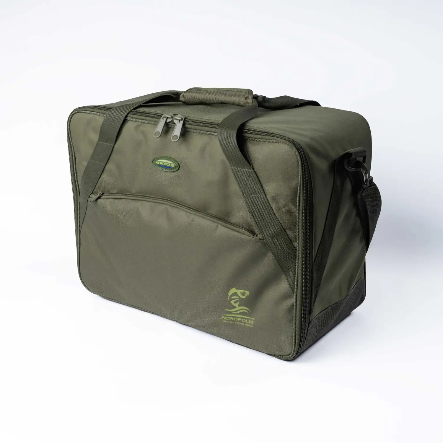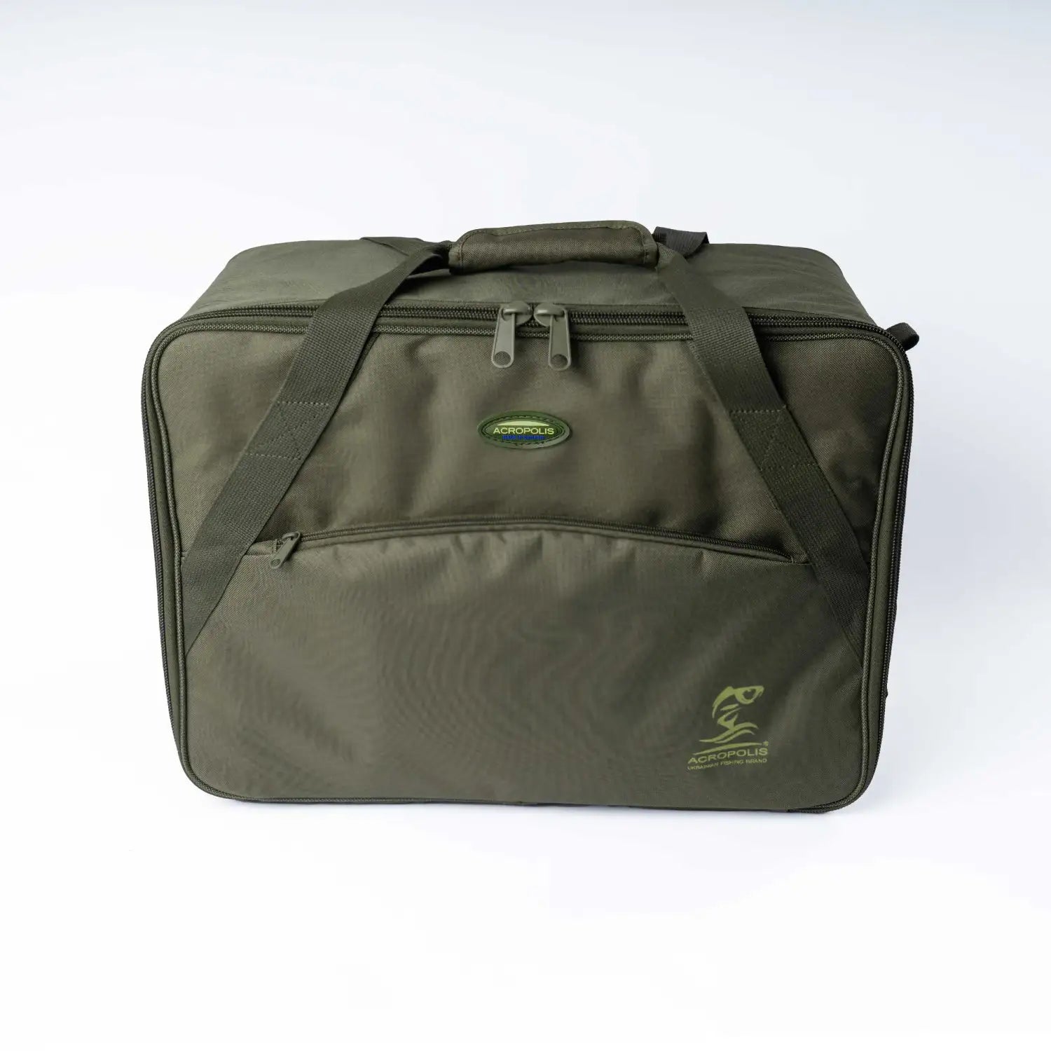 Geanta de pescuit la crap Akropolis RSK-1b (fără cutii) este concepută pentru depozitarea și transportul a 6 role de undițe de crap, role de rezervă, markeri, rachete pentru momeală și alte accesorii. Dispune de un mâner de transport, o curea de umăr confortabilă și un buzunar extern și unul intern. Rolele sunt separate prin separatoare mobile în centrul genții. Pe laterale, există module detașabile cu fermoar pentru accesorii de pescuit. Sunt disponibile și cutii mari și mici din plastic pentru accesorii . Acestea vă vor ajuta, de asemenea, să vă faceți excursiile de pescuit confortabile.
