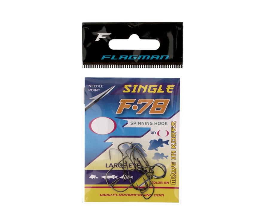 Cârligele simple Flagman F78 au un ghimp unghiular pentru năluci moi articulate, precum și pentru linguri și wobblere. Acestea au un vârf ascuțit ca un ac și un ochi mărit. Forma ghimpului previne alunecarea nălucii moi după o mușcătură și ajută la fixarea sigură a peștelui în cârlig.