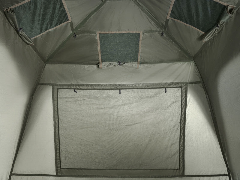 Un alt avantaj important este sistemul de ventilație bine gândit, format din mai multe ferestre și orificii de ventilație. Ferestre spațioase anti-țânțari sunt amplasate pe pereții frontali și posteriori, iar patru ferestre mai mici sunt pe tavan. Datorită acestui fapt, chiar și pe vreme înnorată, este asigurată circulația aerului, ceea ce este util mai ales noaptea - ajută la reducerea condensului pe pereții interiori. Copertina de deasupra intrării protejează de soare și ploaie. Acoperișul este fixat în siguranță de structură cu cleme, ceea ce îl împiedică să se miște în vânt.