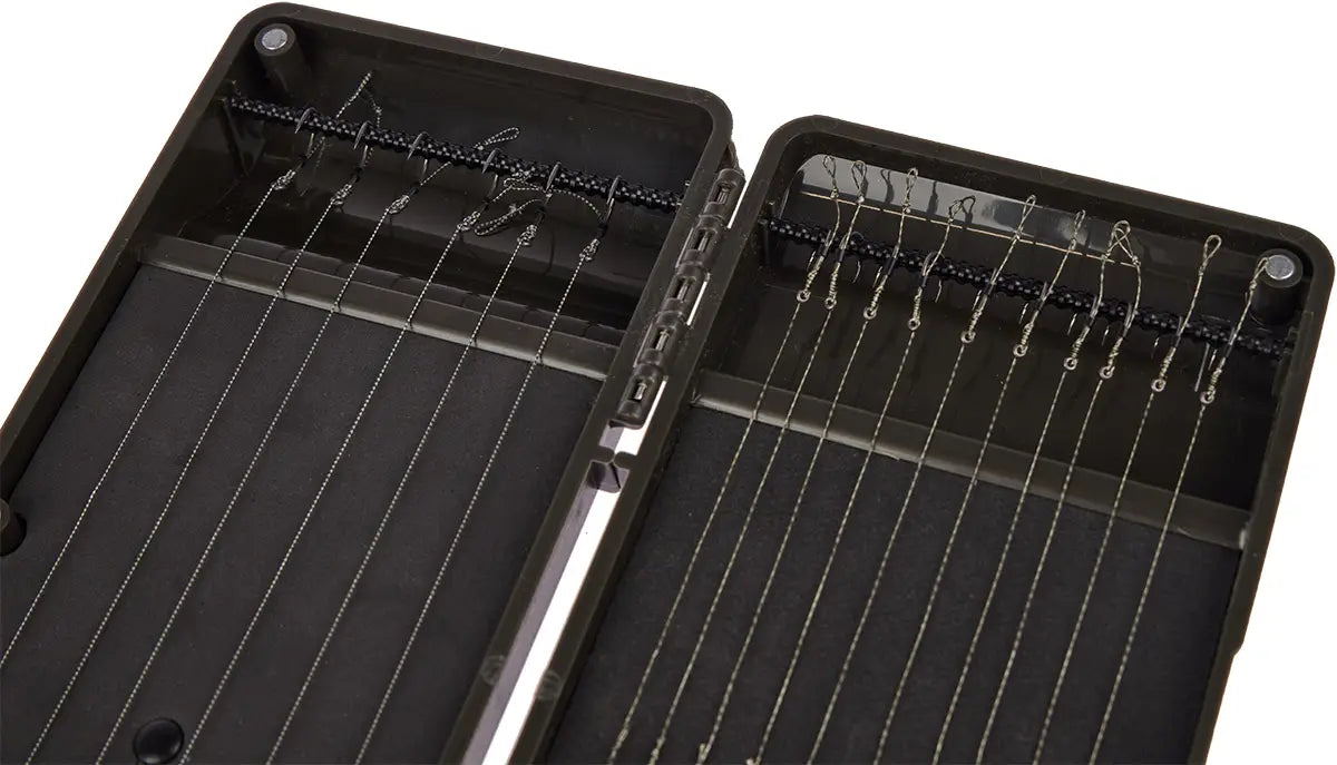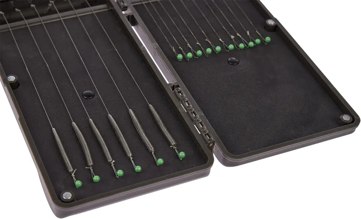Cutia pentru lider este fabricată din plastic de înaltă calitate, cu o căptușeală EVA în interior. Magneții sunt încorporați în corp pentru a fixa în siguranță capacul. Kitul include ace pentru fixarea liderurilor pentru pescuitul la crap.